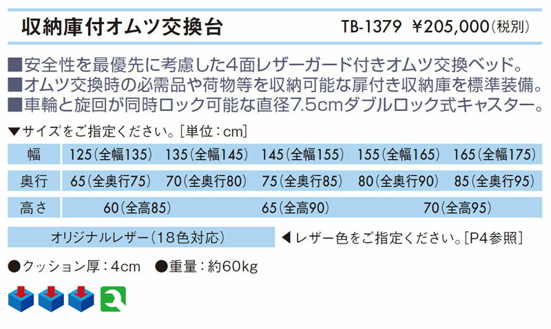 TB-1379 収納庫付オムツ交換台 安全性を最優先に考慮した4面レザーガード付きオムツ交換ベッド。