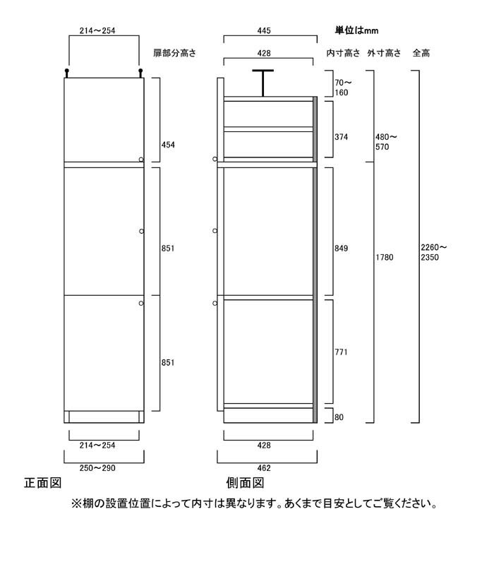 【オプション加工】1.5cm棚板ピッチ、幅木よけ、(配線用)裏板穴加工、タフ棚板穴加工 等 ※幅違い・高さ違い・奥行違いは全サイズ別一覧よりお選び下さい 書斎すきま収納 タフ棚板(厚さ2.5cm) 奥行46cm×高さ226〜235cm×幅25〜29cm サイズオーダー 本棚 幅は1cm単位で指定 書斎すきま収納 本体高さ178cm 突張棚高さ41cm 本体扉高さ170.2cm(全面扉) 突張棚扉高さ45.4cm(全面扉) ご注意 オプション加工選択時、価格は自動計算されません。