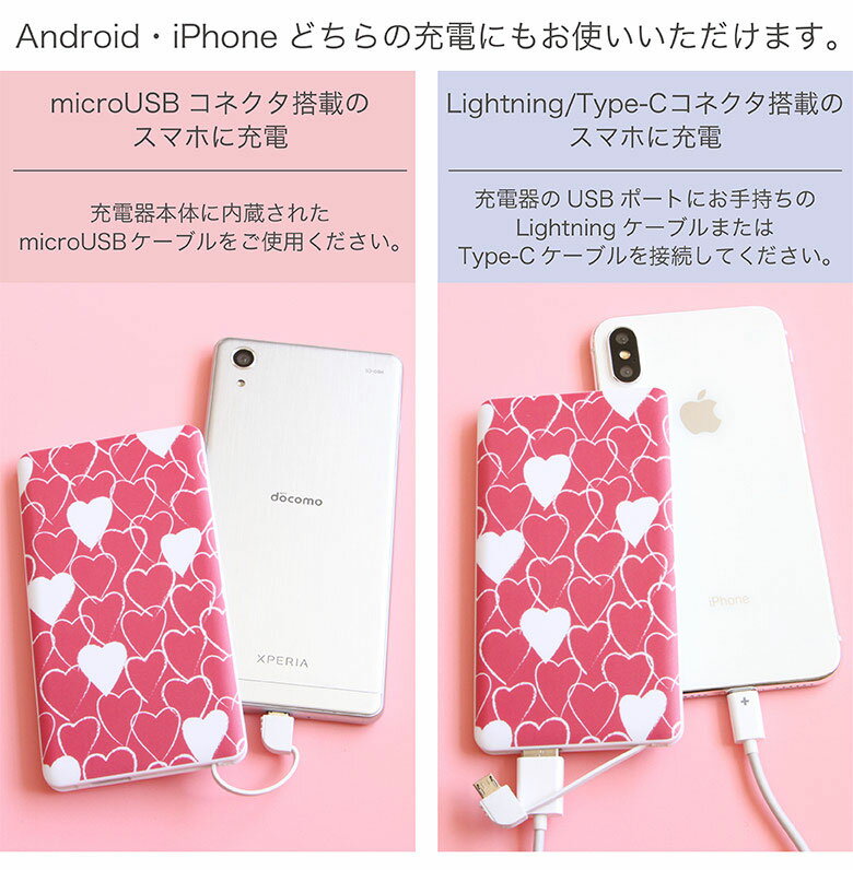 電池容量4000mAhで、2.1Aの急速充電に対応! 大人可愛いハートデザインがたくさん♪