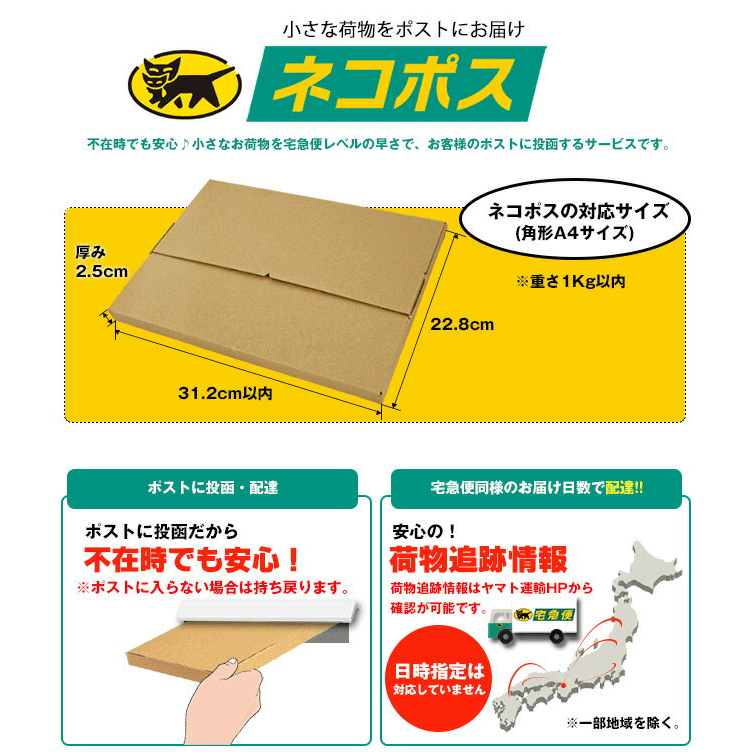 ※ネコポス配送は、ポスト投函タイプの配送方法のため、代金引換決済、配達日時指定不可となります。