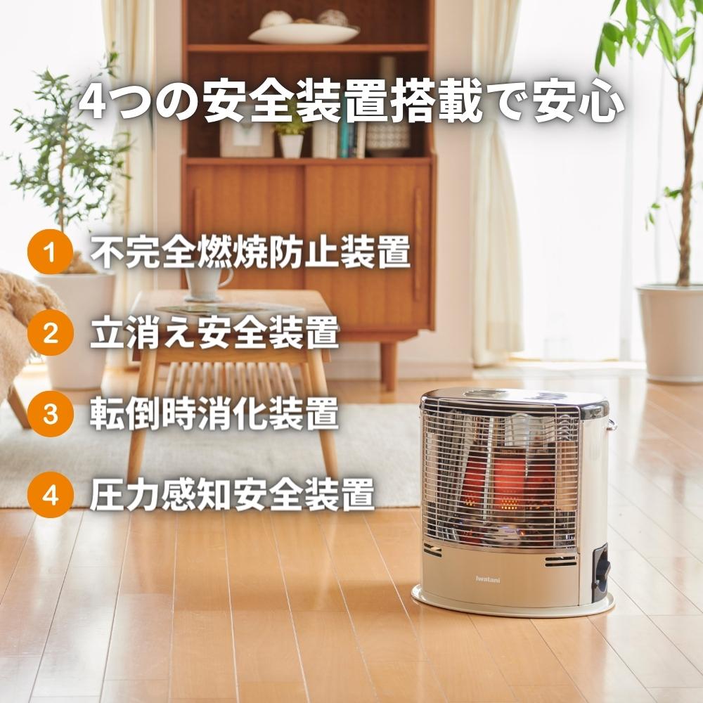 不完全燃焼防止装置 酸素濃度が低くなった時、不完全燃焼をする前に、自動的にガスを遮断してストーブを消火します。