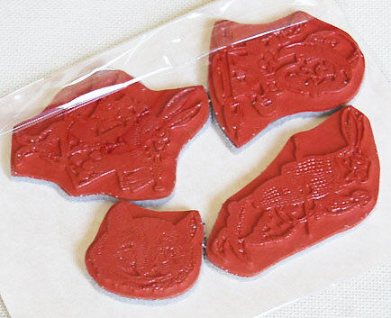 ◇スタンプのイメージサイズ◇ ・懐中時計と白うさぎ:6.8×2.3センチ ・ラッパと白うさぎ:5.8×4.5センチ ・チェシャ猫:2.7×3.1センチ ・ハッター:4.6×4.5センチ ゴム製印面+クッション+粘着シートの3層になっています。