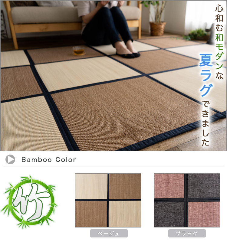 天然の竹を使用した エコ素材・バンブーラグ 竹の持つひんやり感の機能性と、色染めした 竹の色糸を組み合わせデザイン性高い竹ラグを この夏お楽しみください。